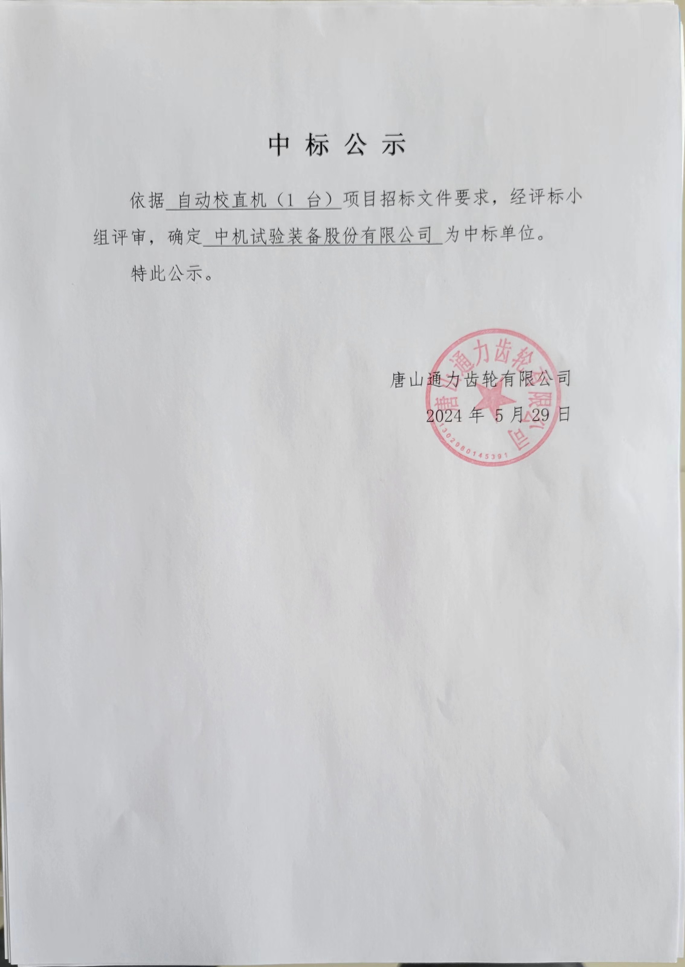 唐山通力齿轮有限公司自动校直机 (1 台)中标公示