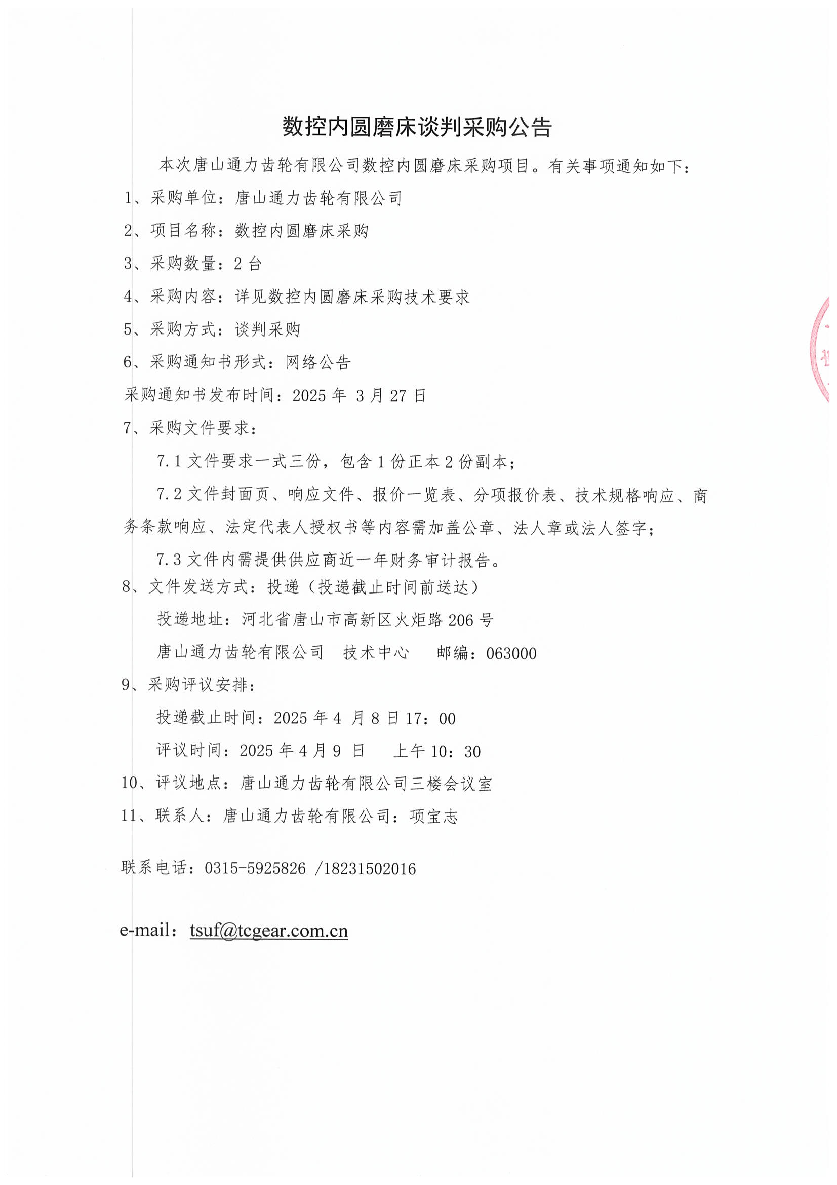 唐山通力齿轮有限公司数控齿轮内圆磨床采购公告