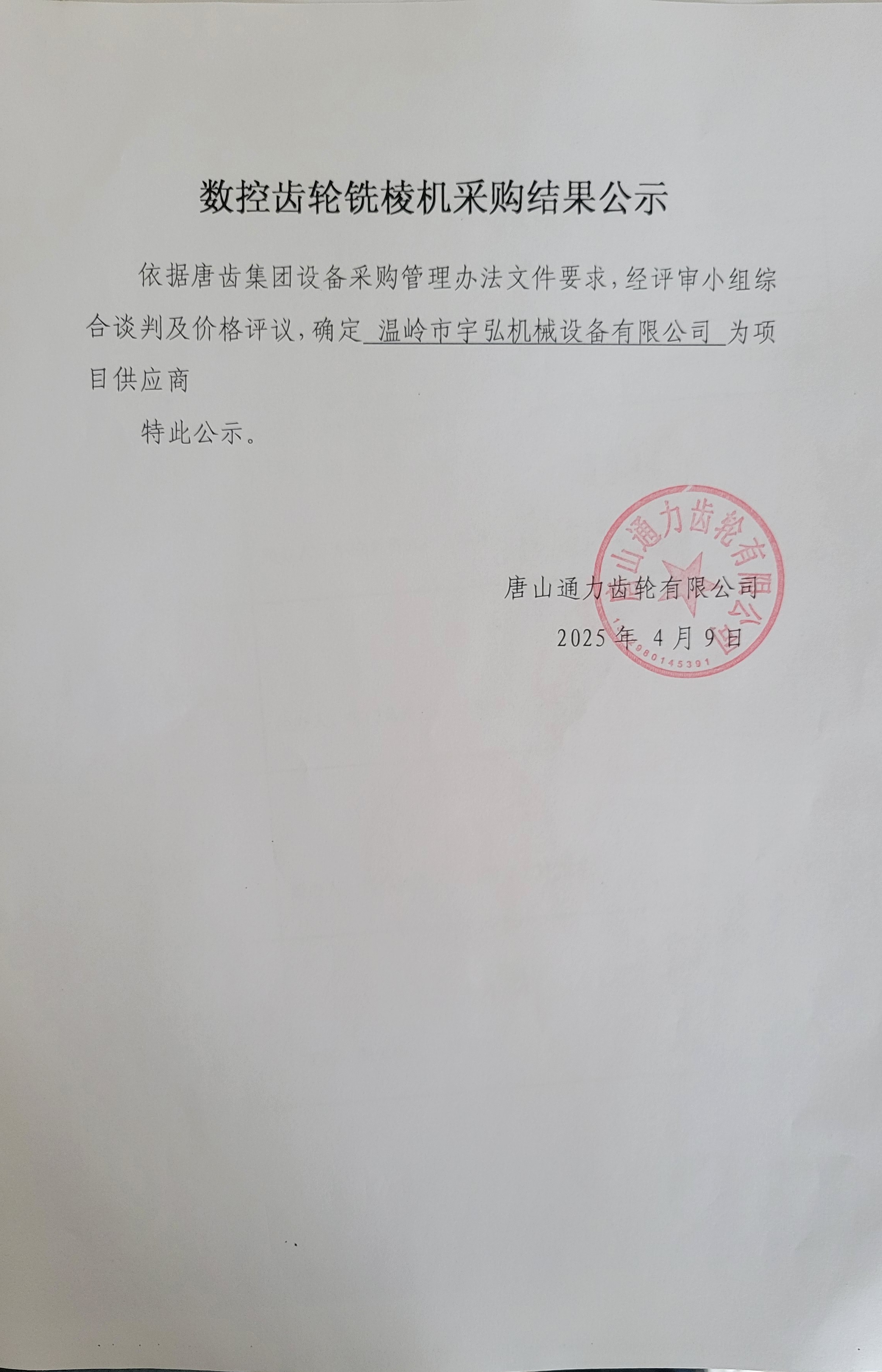 唐山通力齿轮有限公司 数控齿轮铣棱机采购结果公示
