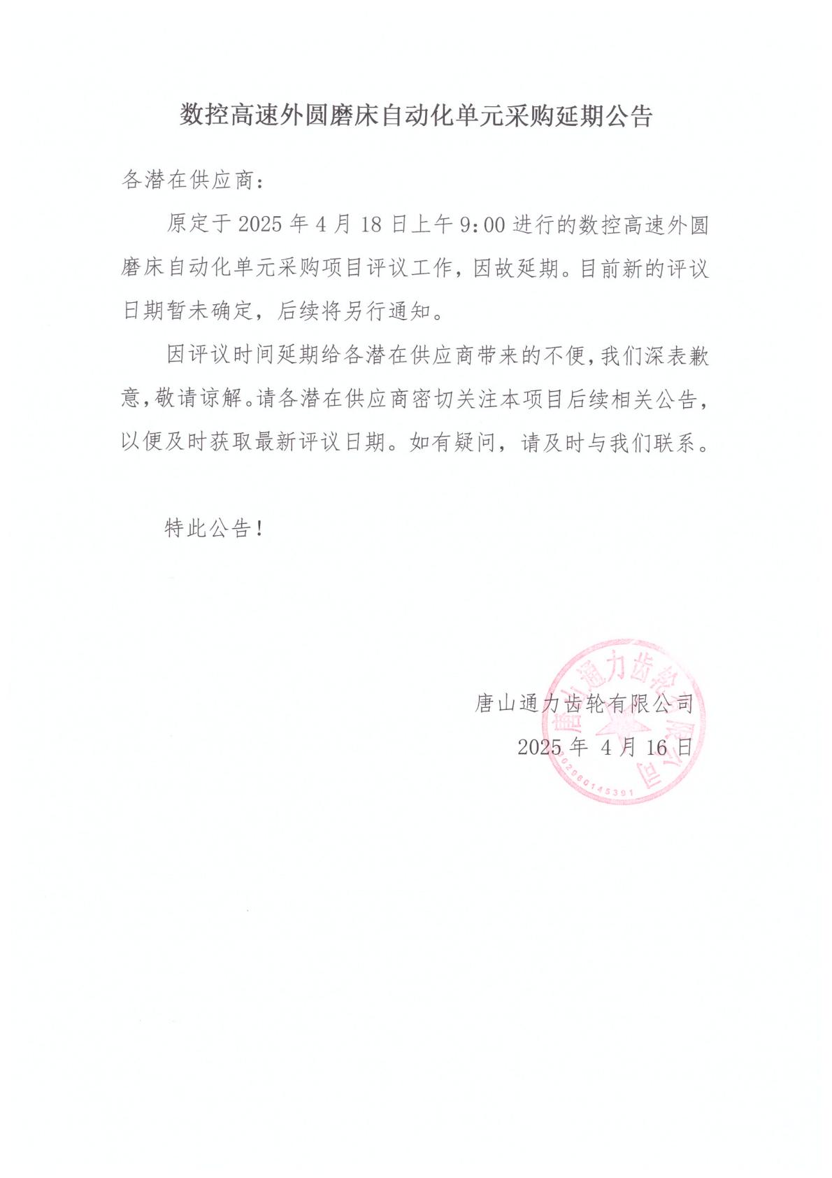唐山通力齿轮有限公司 数控高速外圆磨床自动化单元采购延期公告